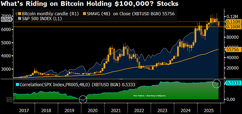 His analysis indicates that the correlation between Bitcoin and the S&P 500 Index remains at 0.53, underscoring how equity market movements still influence Bitcoin’s trajectory. A downturn in stocks could easily amplify Bitcoin’s correction, while renewed risk appetite could help it regain footing above $100K.