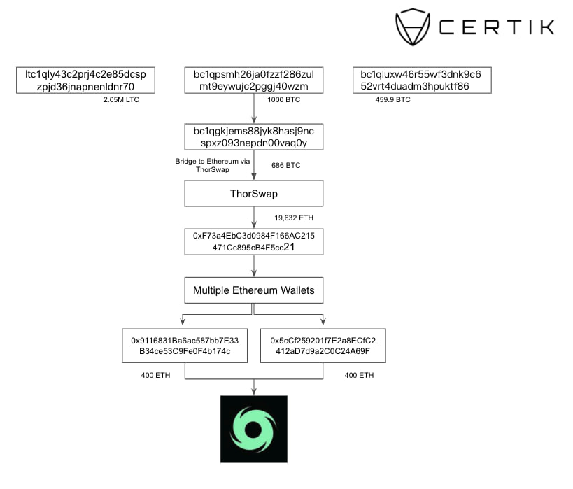 - •Roughly 686 BTC was then bridged to Ethereum via ThorSwap, converting into 19,632 ETH.
