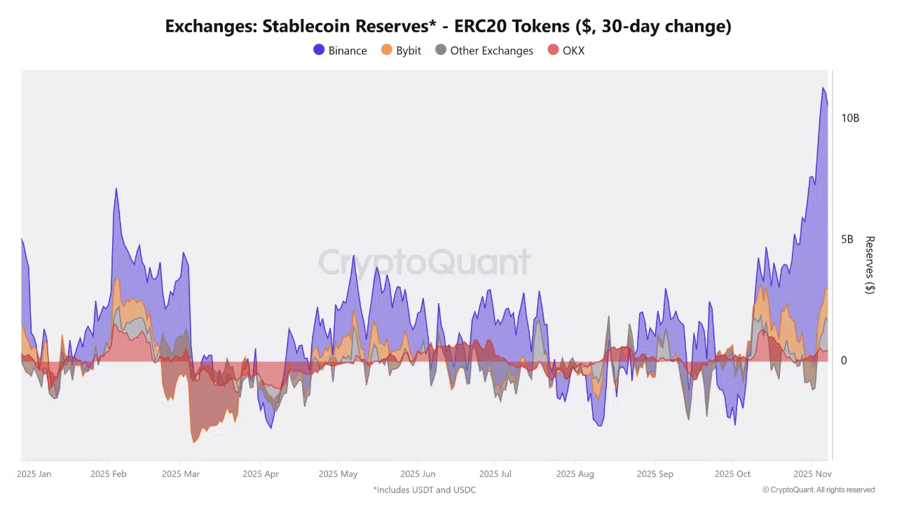 Complementing this capitulation data, a separate report from CryptoOnchain shows that exchange stablecoin reserves have surged by nearly $9 billion in the past month, the largest increase in 2025. The majority of this inflow is concentrated on Binance, which accounts for more than two-thirds of the total growth.