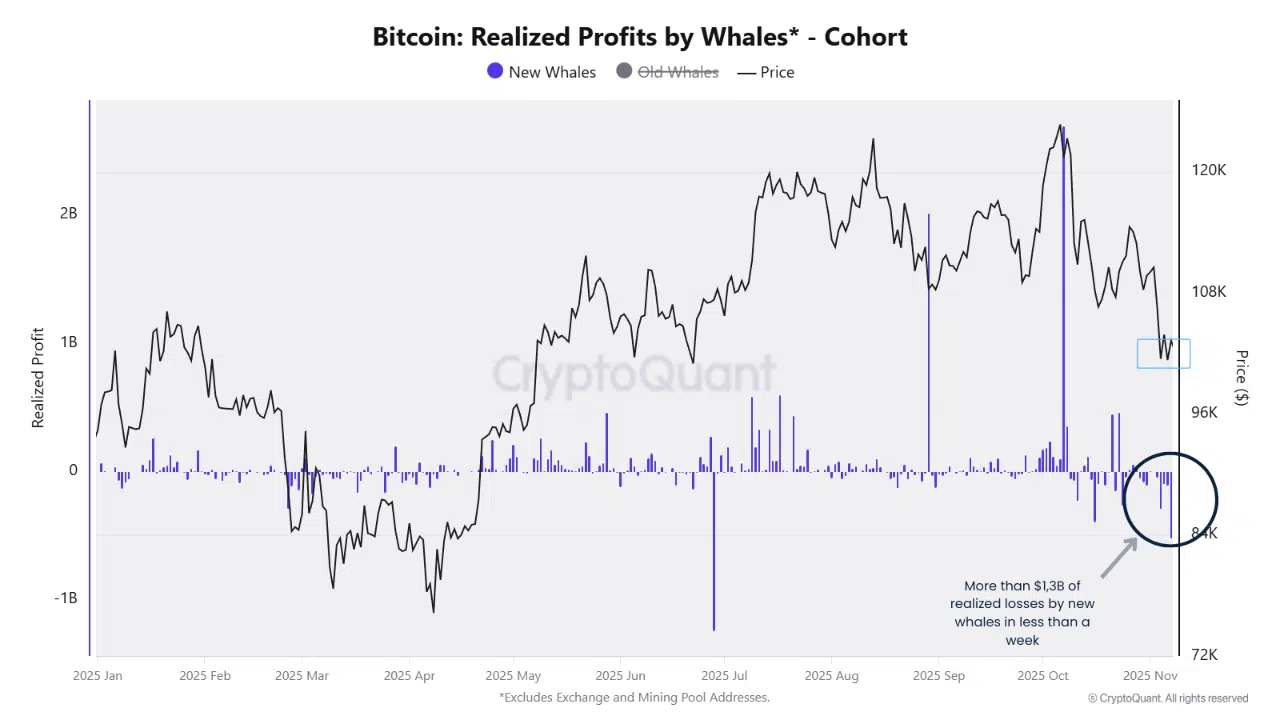 Analyst MorenoDV reports that over the past six days, new Bitcoin whales have realized over $1.3 billion in losses, marking one of the most aggressive capitulation streaks of 2025. This wave of selling typically reflects forced liquidations or loss aversion from newer, leveraged entrants.
