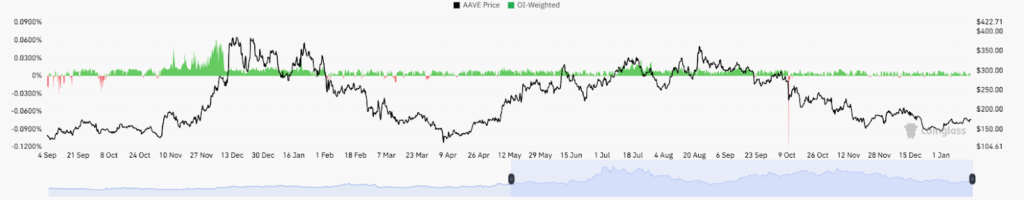 AAVE gains further context from liquidation and derivatives data following the October volatility event. That period saw a sharp spike in long liquidations alongside a sudden price drop. The move flushed overleveraged positions and marked a leverage reset. Price then entered a more orderly consolidation phase.