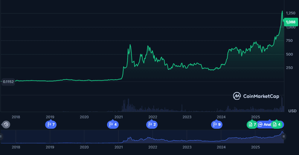Binance Coin currently trades at $1,089.82, with a market capitalization of $150.09 billion and a 24-hour trading volume of $4.36 billion. In the last 24 hours, it rose modestly by 0.25%, although the seven-day trend shows a 1.6% decrease. Over the past month, Binance Coin has increased by 5.98%, while its one-year gain stands at 89.2%, reflecting strong adoption and ecosystem growth. With an all-time high of $1,370.55 and an all-time low of $0.09611, Binance Coin has demonstrated resilience, attracting long-term holders who prioritize exchange utility and network effects.
