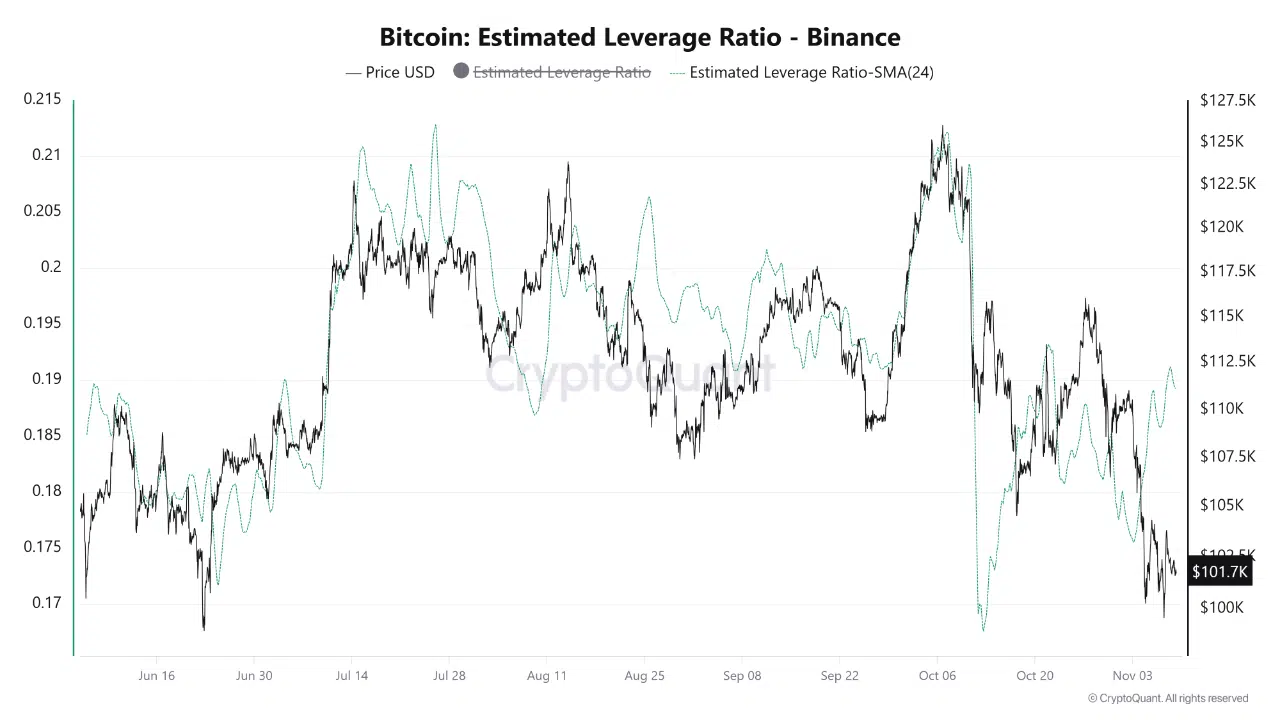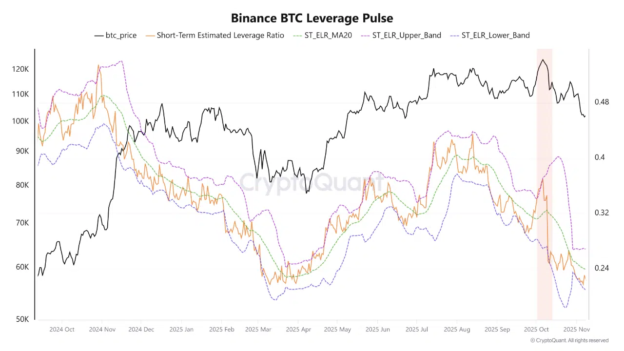 According to a new CryptoQuant report shared by analyst Crazzyblockk, leverage in the Binance Bitcoin futures market has cooled significantly following the latest market pullback. The exchange’s Short-Term Estimated Leverage Ratio (ST_ELR), which measures open interest relative to stablecoin reserves, dropped sharply to 0.2247 as of November 8, 2025.