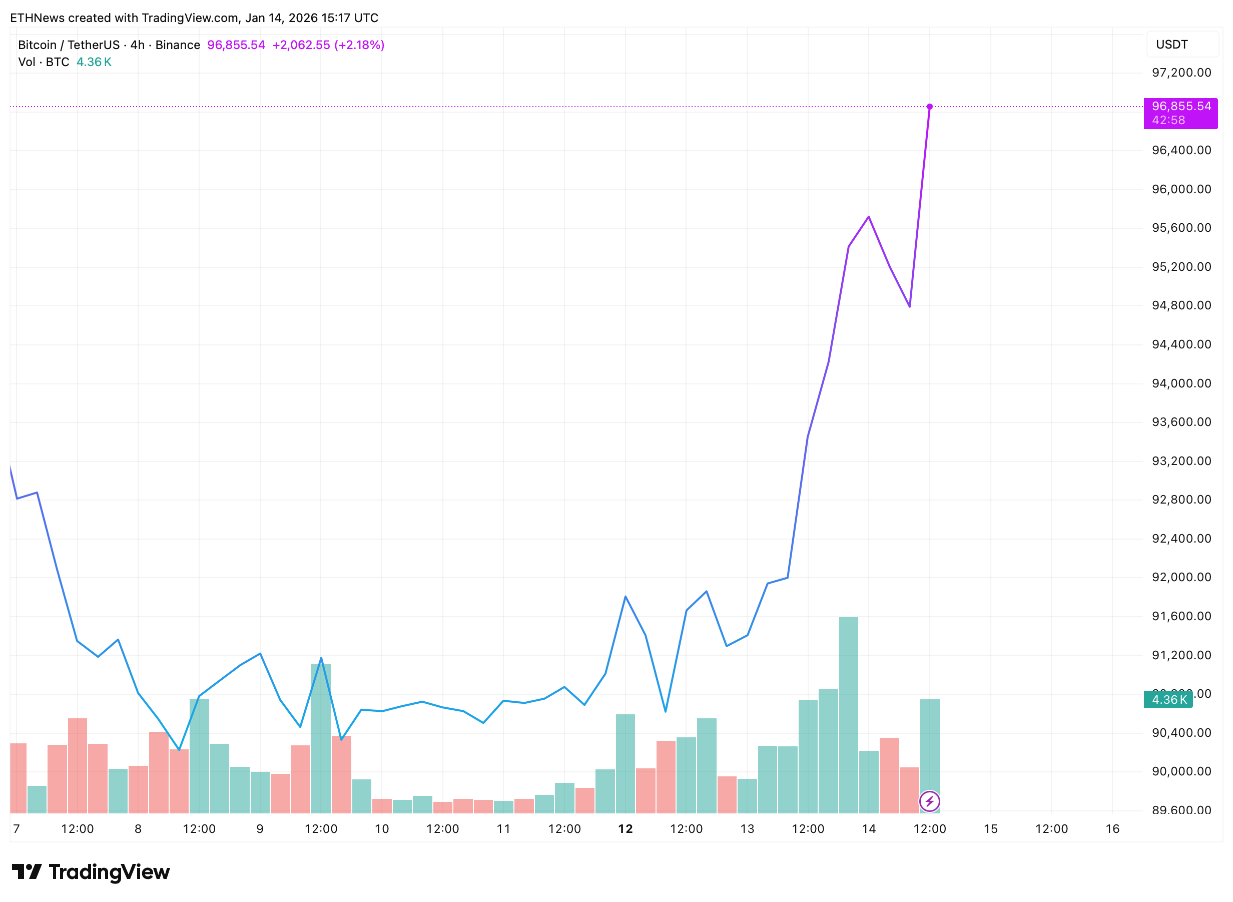 On Binance, BTC/USDT was trading around $96,850 at the time of writing, up more than 3% for the day. The advance places price near the upper end of its recent range, following a rapid recovery from earlier consolidation.