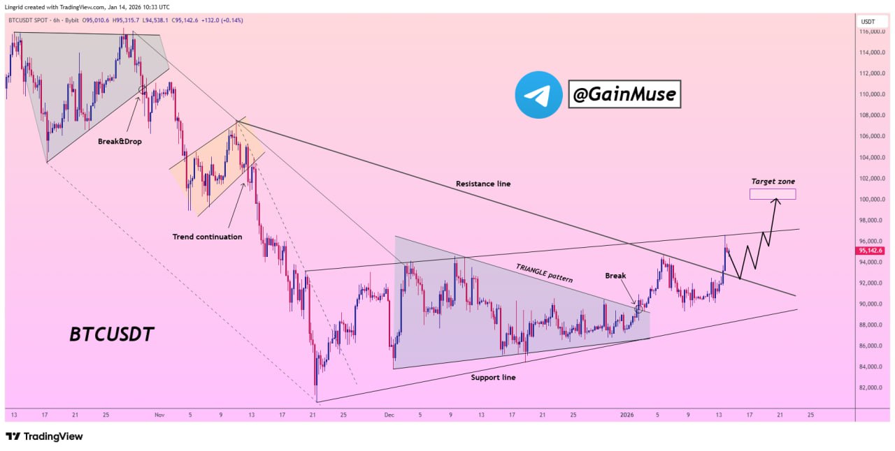 A broader technical view shared by crypto trader Gain Muse focuses on Bitcoin pressing against a long-term descending resistance line. The analysis highlights a controlled recovery from December lows, followed by a triangle formation that has already broken to the upside. Since that break, price has continued to ride a rising support line while compressing beneath overhead resistance.