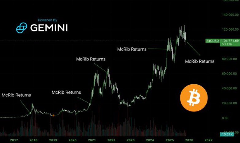 The chart shared by Bitcoin Archive, powered by Gemini, highlights a pattern few would expect: each McRib comeback since 2017 has coincided with a sharp Bitcoin surge. When the sandwich reappeared in November 2017, Bitcoin soared over 1,000%, marking the start of its first major bull run. In December 2020, the next re-release aligned with a 200% gain, setting up Bitcoin’s climb to its $69,000 all-time high in 2021. Then, in late 2024, another McRib revival preceded Bitcoin’s breakout to a new high near $126,000.