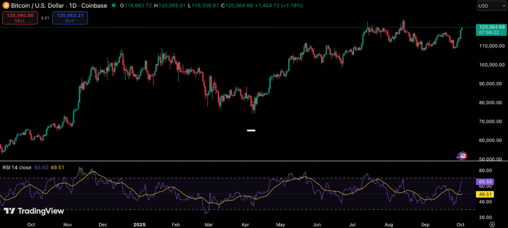Bitcoin’s current levels suggest further upside could be on the table. The daily RSI is holding at 65, showing strong bullish strength without signaling overbought territory. According to TradingView, moving averages overwhelmingly flash “Strong Buy,” hinting at sustained momentum. Analysts highlight resistance at $123,000‑$125,000, while support is forming around $115,000.