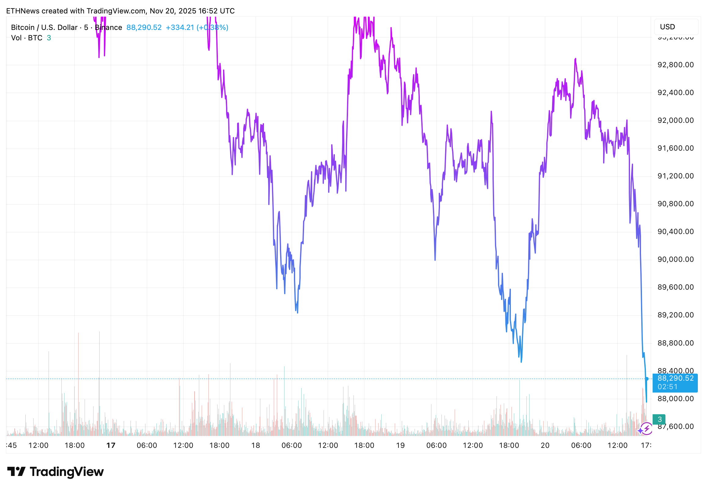 This shift is visible directly on the charts. Every time Bitcoin attempted to reclaim the $92,000–$93,000 level, sellers overwhelmed buyers. When macro headlines reached trading desks, the price began a steep slide, ultimately cascading toward the $88,000 region on accelerating volume. The downside momentum suggests that part of today’s move was fueled by liquidations, traders instantly closing leveraged positions as funding conditions tightened.