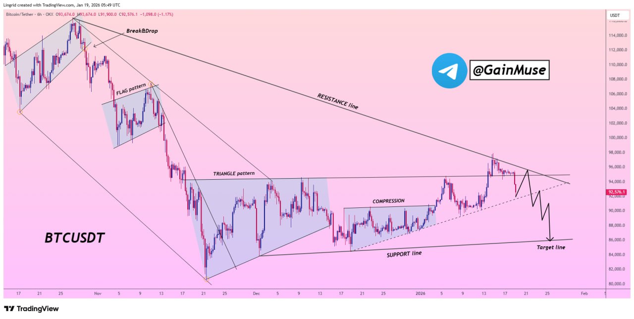 While the rising support trendline has held so far, GainMuse notes that a clean breakdown below the $92,000 area would likely invalidate the compression structure. In that scenario, price could accelerate toward the lower projected target zone between $88,000 and $90,000, where previous demand clusters formed.