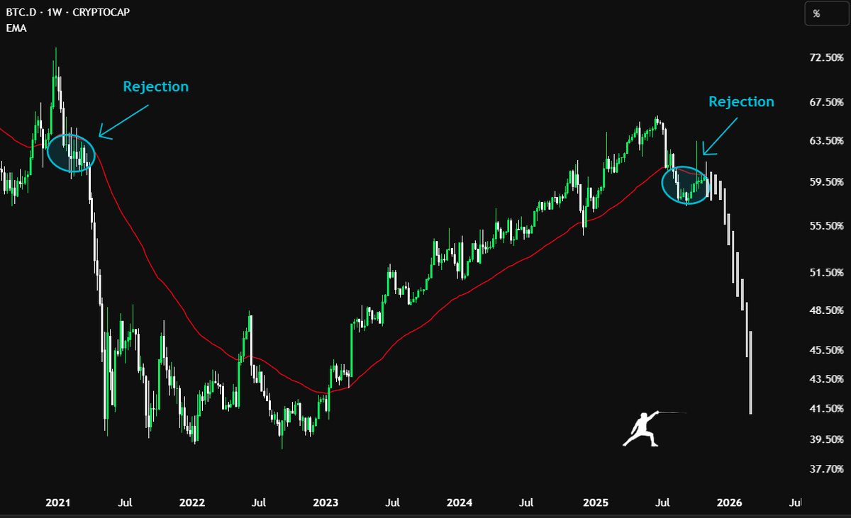 Analyst Rekt Fencer highlighted that Bitcoin dominance, the measure of Bitcoin’s market share relative to all cryptocurrencies, has faced a technical rejection similar to the one that occurred in early 2021. Back then, the same structure preceded one of the most intense altseasons in crypto history, when tokens like Solana, Avalanche, and Cardano saw triple-digit surges.