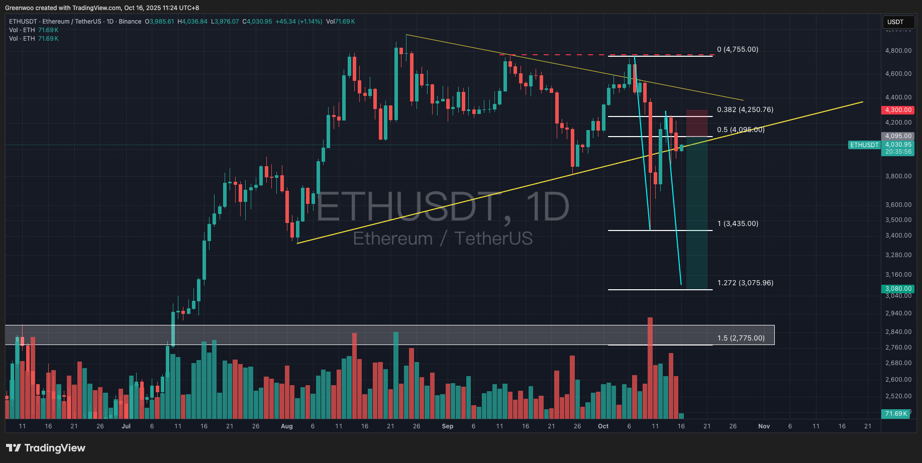 As of writing, it is temporarily reported at $4,030. Investors can choose to enter a short position at market price or set up a short order near $4,095 (the latter being Fibonacci 0.5). Take‑profit targets can be set in batches at $3,435 / $3,080 / $2,800. Stop‑loss can be set above $4,300.