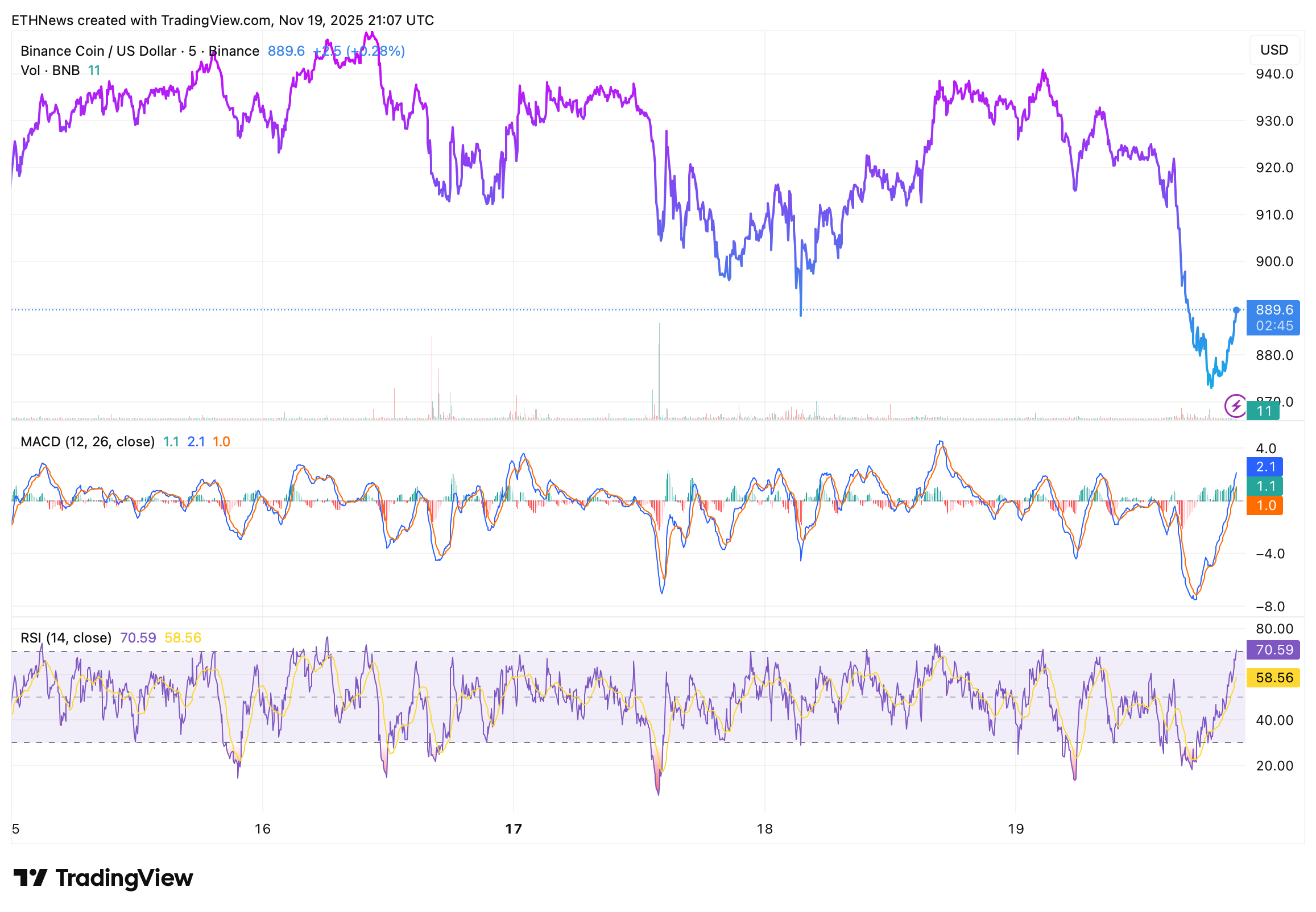 BNB’s rejection at $935 earlier in the week set the stage for sellers to regain control. Once the price slipped under $900, algorithmic trading systems kicked in, accelerating liquidation flows and pushing BNB to an intraday low near $875.