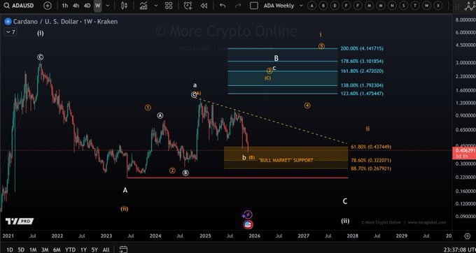 Cardano is trading within a complex B-wave retracement as described by the analyst More Crypto Online. The broader support region sits between the 61.8% and 78.6% Fibonacci retracements at $0.437 to $0.322. Price action inside this zone often develops during extended corrective phases.