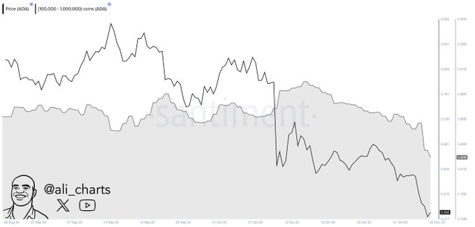 The chart shared by analyst Ali (@ali_charts) shows a sharp decline in whale holdings, indicating heavy distribution among addresses holding between 100,000 and 1,000,000 ADA. Over the past week, these entities offloaded more than 4 million ADA, driving short-term weakness across the market.