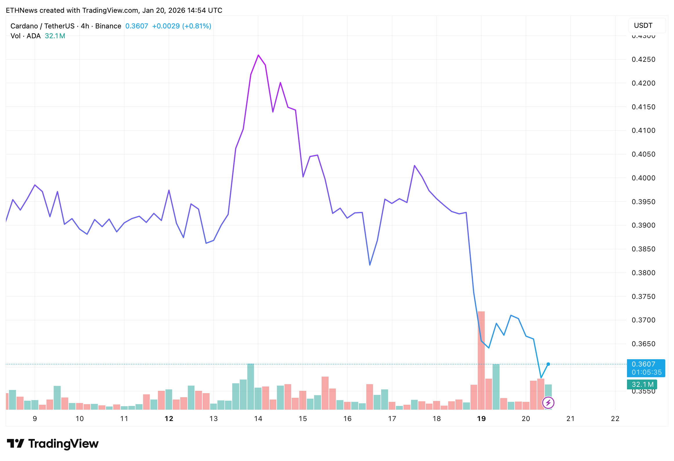 The chart shows ADA pushing higher into the mid-$0.40 area earlier in the period before reversing sharply.