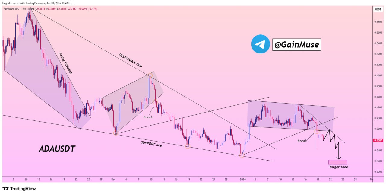 The most recent leg lower coincided with a sharp expansion in red volume, pushing ADA into the $0.36 area before stabilizing. This drop aligns with the loss of a key short-term level visible on the chart, after which price briefly bounced but remained capped below the broken zone. The inability to reclaim that level keeps downside pressure elevated, as recovery attempts continue to meet supply.
