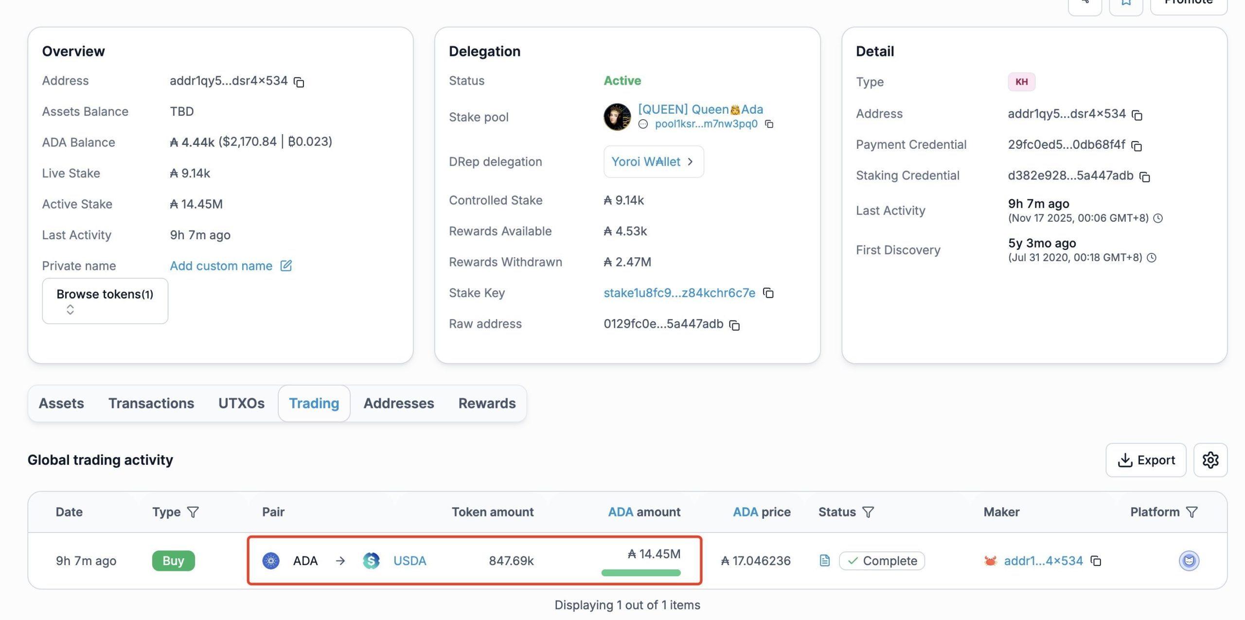 According to on-chain data reviewed by investigator ZachXBT, the wallet, active for the first time since September 2020, swapped 14.4 million ADA (worth $6.9 million) for just 847,696 USDA, a Cardano-native stablecoin pegged to the U.S. dollar. Instead of receiving close to the expected dollar value, the holder walked away with barely 10% of the tokens’ real market worth.