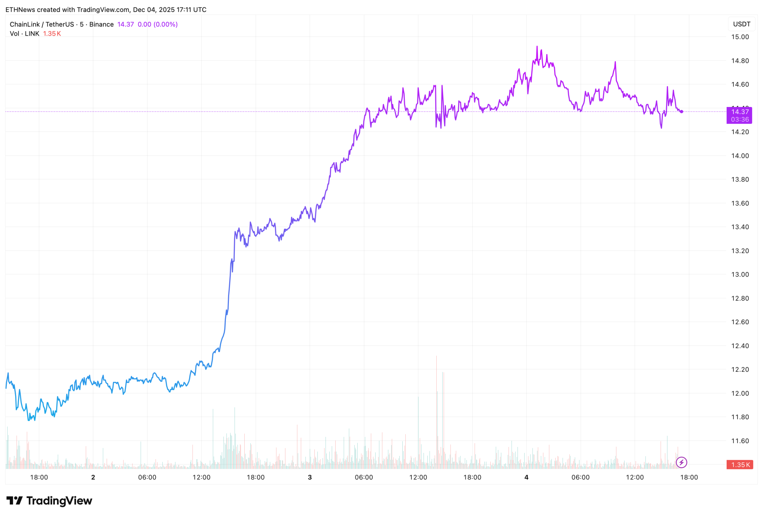 The chart shows an aggressive surge beginning late on December 2, followed by steady consolidation above $14. This move aligns with high-volume inflows sparked by the ETF launch and growing institutional activity around Chainlink’s technology.