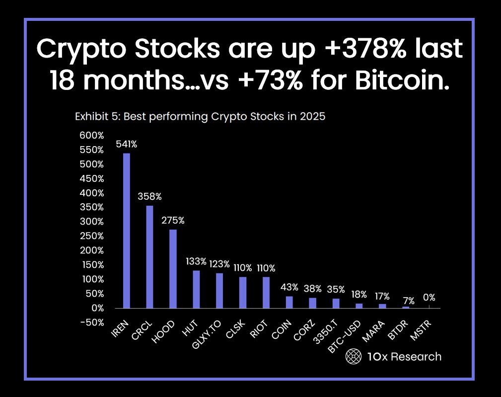 Bitcoin miners and crypto-linked equities are now vastly outperforming Bitcoin itself, according to a new report from 10x Research. The firm’s BTC Mining Index has gained an impressive +378% over the past 18 months, compared to Bitcoin’s +73% rise in the same period, marking one of the widest performance gaps in crypto’s modern market cycle.