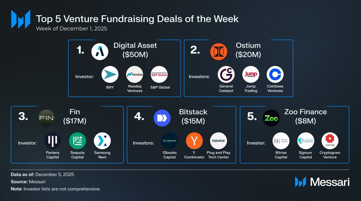 The shift follows months of quieter allocations, but this week’s data signals that capital is again flowing with confidence into key infrastructure projects, enterprise fintech, and new onchain financial primitives. Messari’s latest breakdown highlights the strongest five deals, collectively raising $165 million, a figure that suggests institutional appetite is quietly rebuilding despite market volatility.