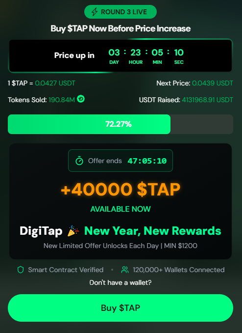 On the other hand, Digitap’s crypto presale is a great entry point into the industry. Currently, the $TAP token is available at $0.0427, a 69.5% discount from its launch price of $0.14. This project has a fixed pricing model designed to increase with every round.
