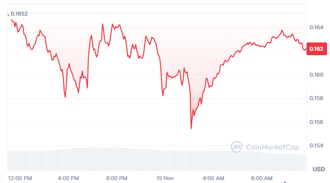 The coin has a market capitalization of approximately 24.63 billion and its supply in circulation is 151.75 billion tokens. Short-term traders and automated flows appear active, shaping the quick shifts recorded inside the observed window.