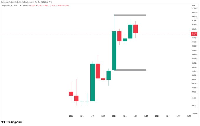 Dogecoin’s yearly chart shows four consecutive inside candles, forming a rare long-term compression. These candles remain within the boundaries of the large 2021 mother candle, which still defines the broader range. The current arrangement keeps price within the upper portion of this macro zone.