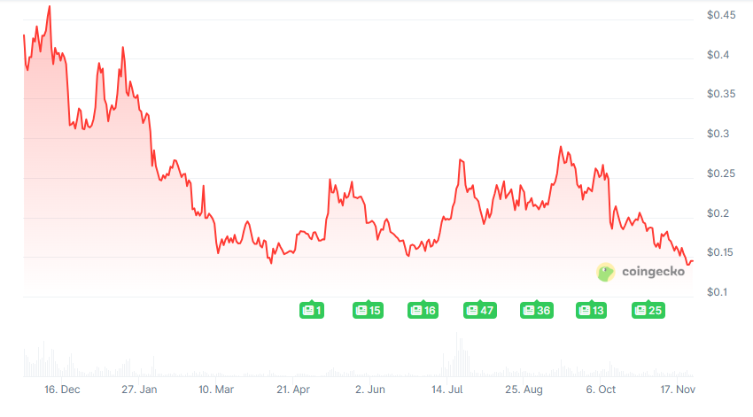 As of the one-year chart, DOGE trades around the area of $0.145, and it has decreased by 66.2% in the last one year. Price action developed a series of low highs to the beginning of 2024, then a general drift around the range of $0.12-$0.22 between the spring and the end of the summer. Market activity signaled a transition from sharp swings to narrow movement.