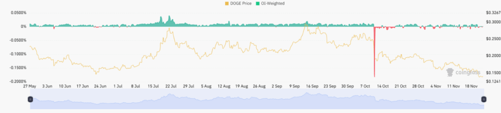 The OI-Weighted Funding Rate chart shows a series of flat readings for extended stretches. Funding turned negative through early summer, reflecting caution among traders as DOGE drifted lower. Price action during that period remained stable, with no forced liquidations.