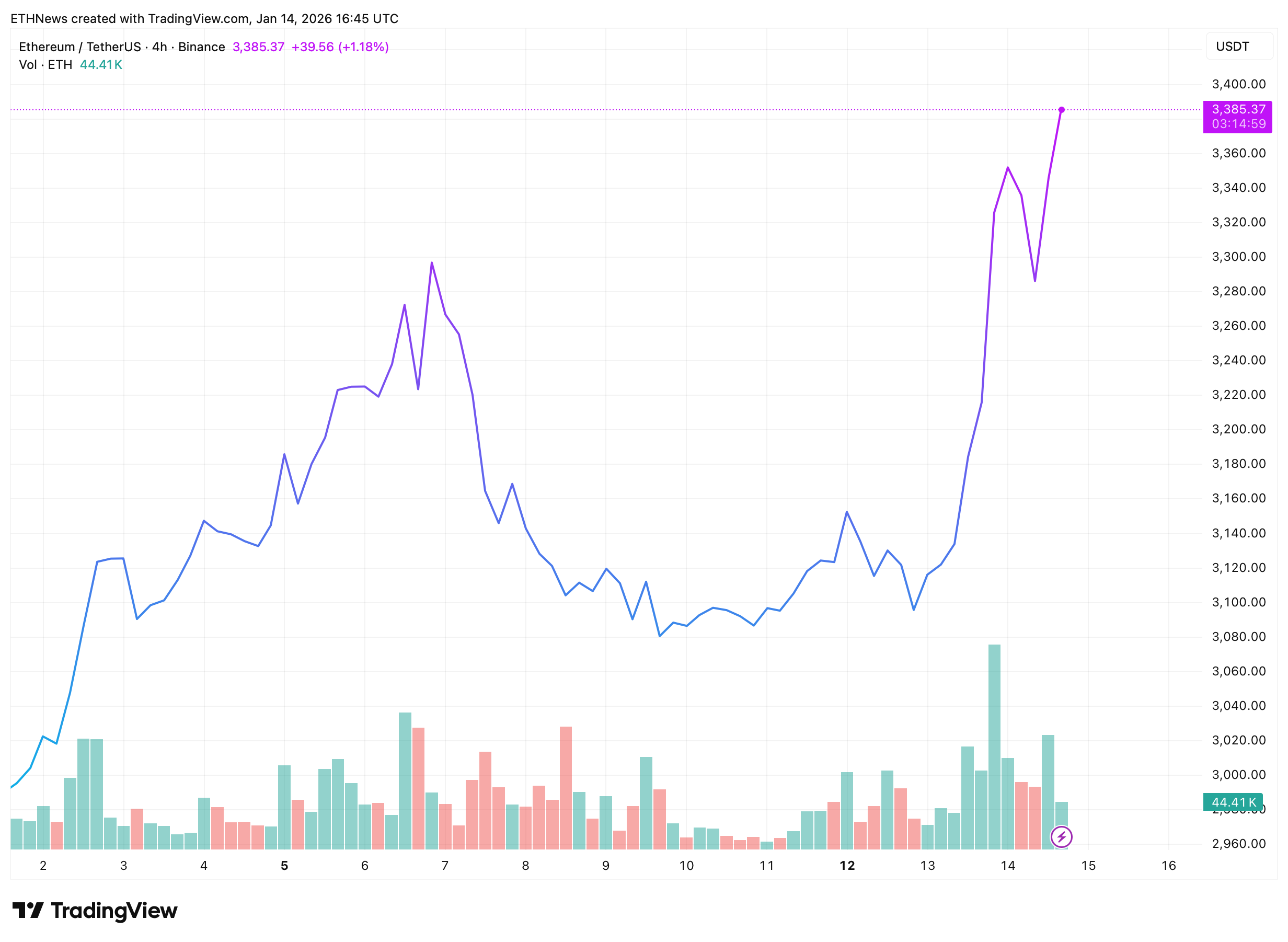 The four-hour chart shows a clear momentum shift. Ethereum transitioned from a choppy base into a steep upside move, briefly pulling back near $3,290 before resuming higher toward $3,385. Rather than fading back into the prior range, price held elevated, signaling sustained demand at higher levels.