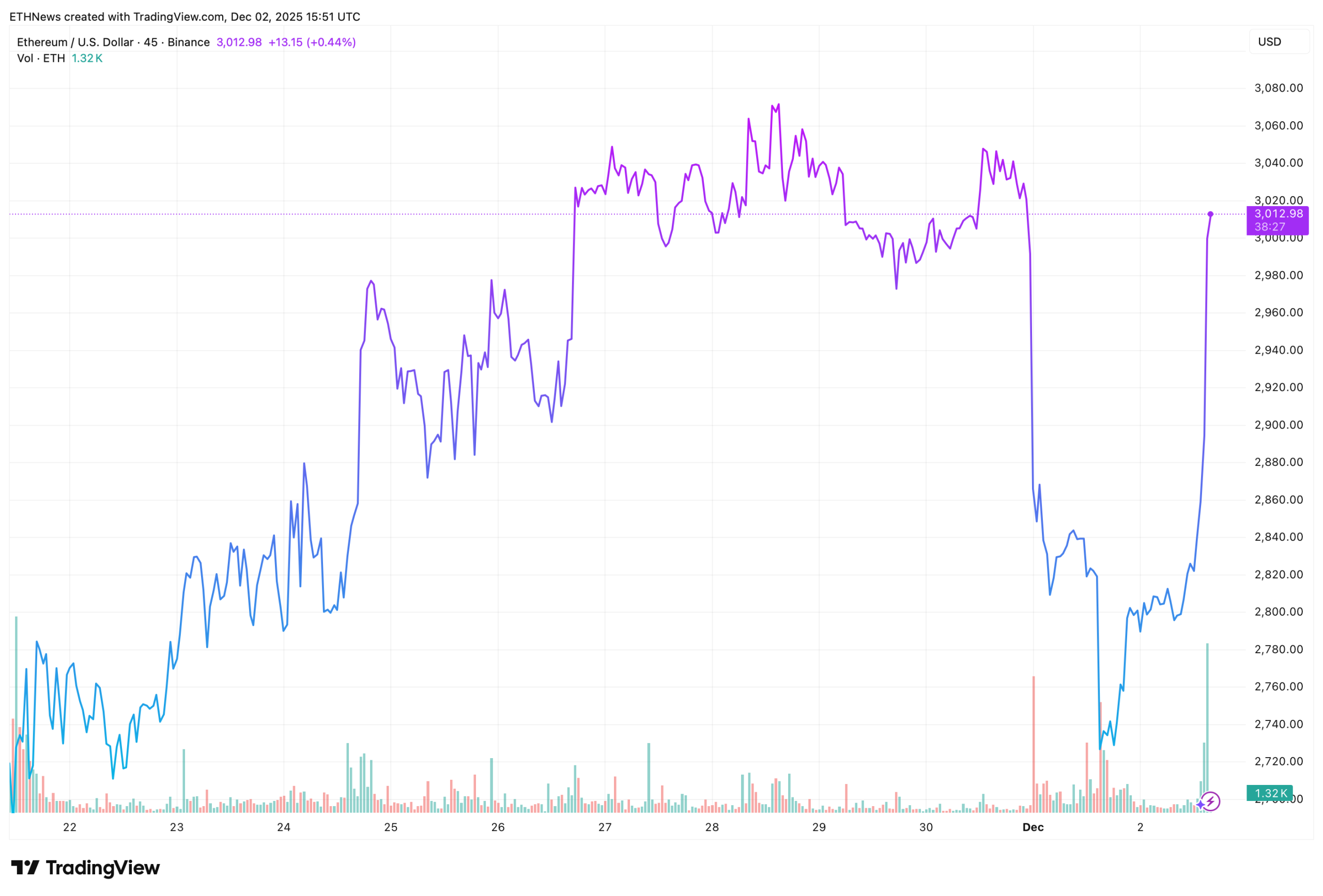 The chart shows a pronounced V-shaped recovery unfolding over the past several hours. ETH slid below $2,750 before buyers stepped in aggressively, driving price back to the $3,010–$3,020 range. The move erased much of the prior drawdown and signals that dip-buyers continue to defend key short-term support.