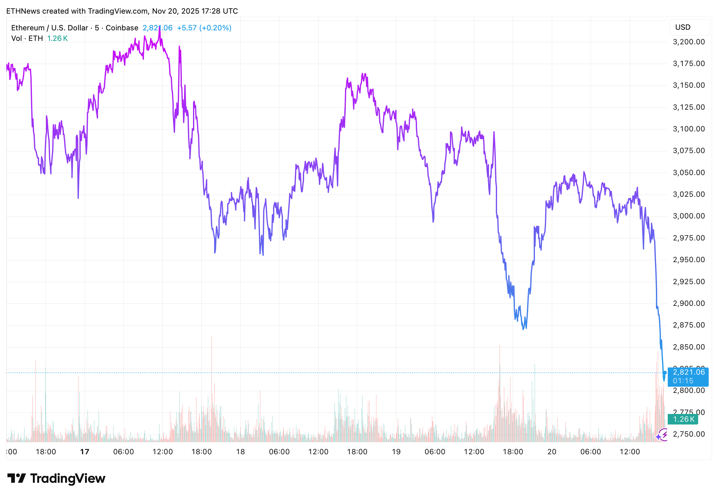 On the chart, ETH shows a clear pattern of lower highs and lower lows over the past three days. Multiple recovery attempts stalled around $3,050–$3,100, forming a repeated resistance zone. The late-session breakdown pushed Ethereum below short-term support at $2,900, with heavy sell volume confirming momentum to the downside.