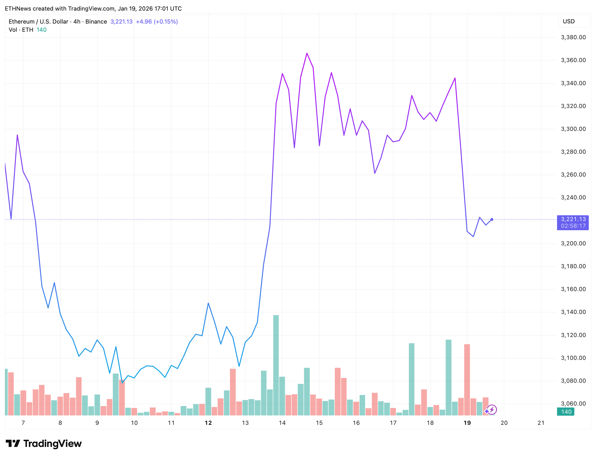On the 4-hour chart, ETH is trading near $3,220, stabilizing after a sharp pullback from the $3,340–$3,360 area. That rejection marked a clear shift in short-term momentum. Price failed to hold the breakout attempt and quickly slipped back into a tighter range, signaling exhaustion rather than follow-through.