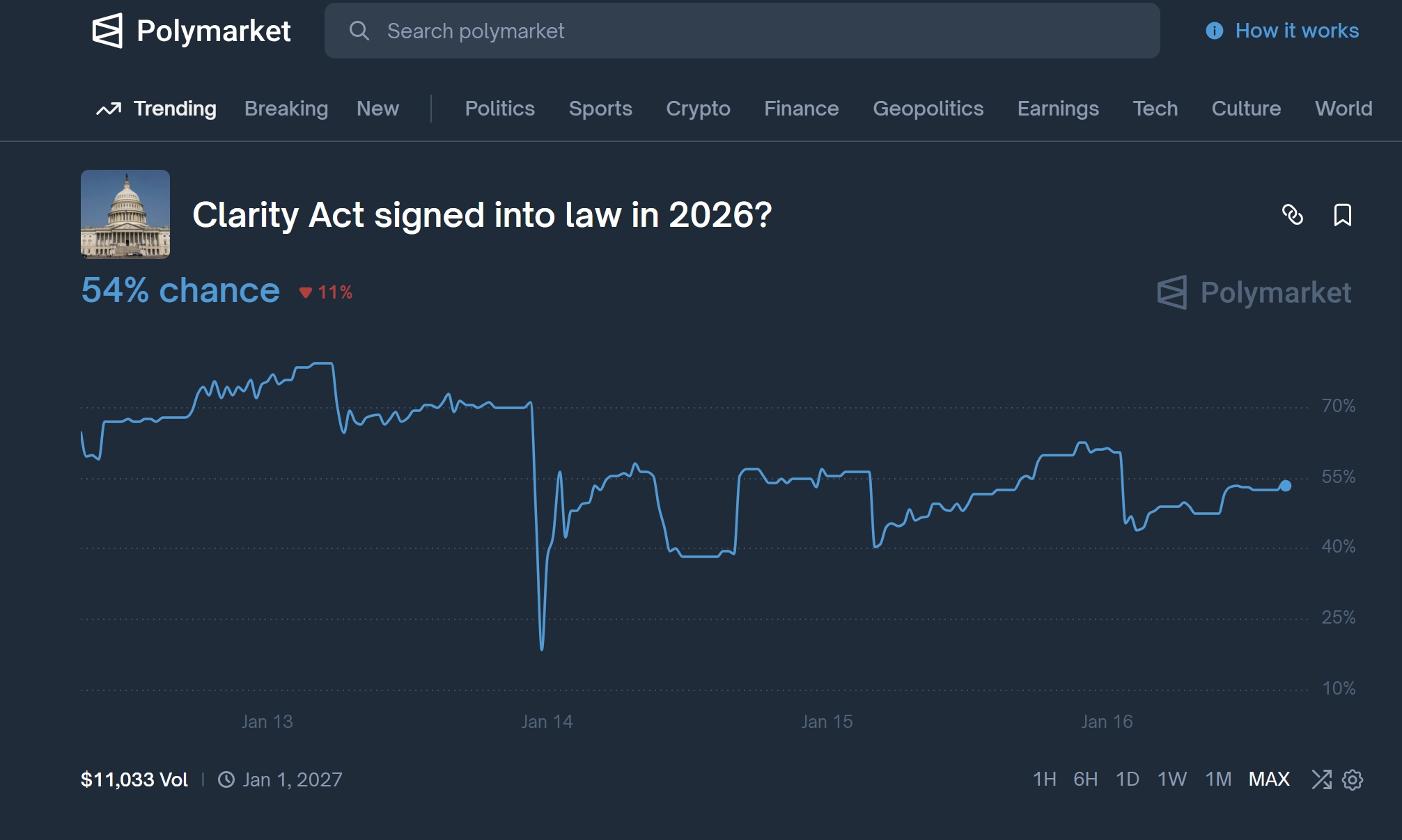 This first article focuses on the Clarity Act itself: what it tries to define, why that definition matters, and where the bill sits in the legislative process today. A second piece will turn to the prediction market question—because there is, in fact, an active Polymarket contract tied to whether this exact bill becomes law by the end of 2026—and explore what signals would meaningfully shift the odds.