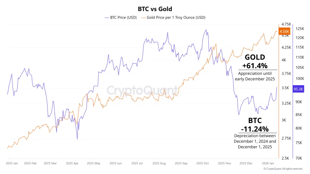 The CryptoQuant chart illustrates gold’s steady climb throughout 2025 as Bitcoin moved sideways to lower. Gold’s rally marked its strongest annual performance since 1979, culminating in a new record high near $4,600 per ounce.