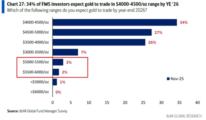 Only 5% of global fund managers believe gold will break above $5,000 per ounce by 2026, a remarkably small group given strong long-term demand drivers such as rate-cut expectations, rising geopolitical tension, and persistent inflation concerns.