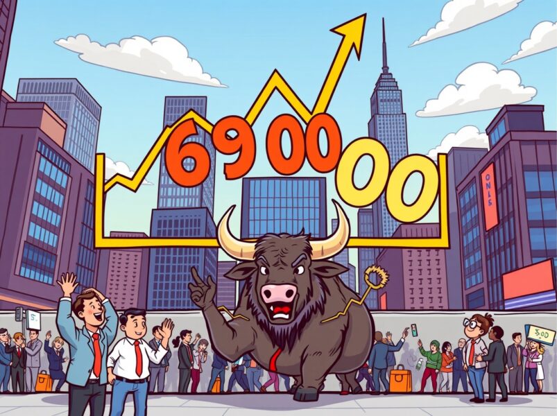Reaching 6900 for the first time signifies a new all-time high for the index. This indicates strong corporate earnings, robust economic activity, and high investor confidence in the market. It often reflects a period of economic expansion and growth.