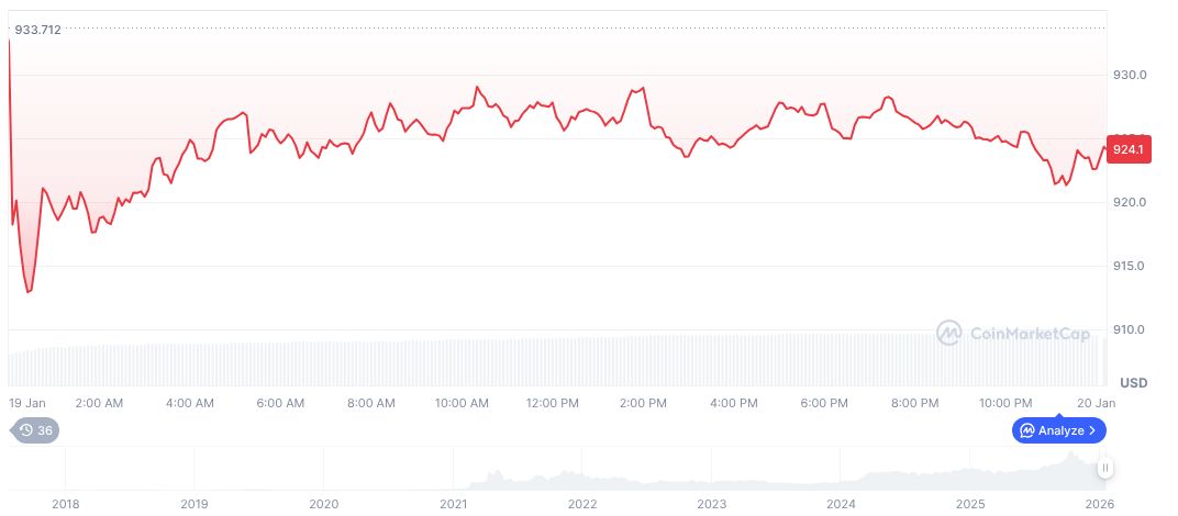 BNB is trading at $924.55, with a market cap of $126.07 billion. Its 24-hour volume stands at $2.94 billion. The price has fluctuated marginally by 0.33% over the last 24 hours and decreased by 12.81% over 90 days. Notably, BNB sustains 4.02% market dominance.