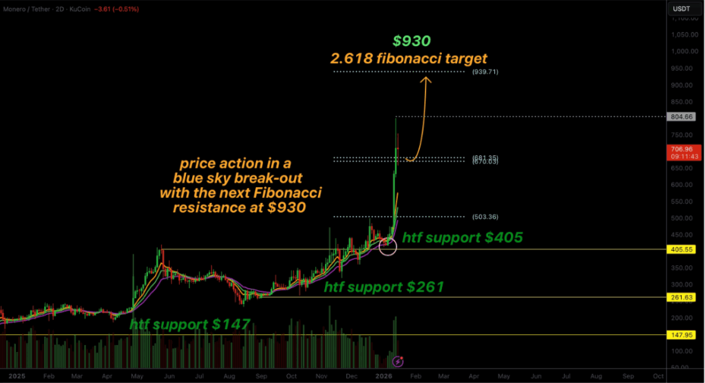 Monero is maintaining its upward momentum after firmly reclaiming the $670 Fibonacci extension level. The cryptocurrency has now entered a blue-sky breakout phase, trading above historically significant resistance with limited overhead supply. Strong price action above this level has turned previous resistance into support, setting the stage for continued gains.