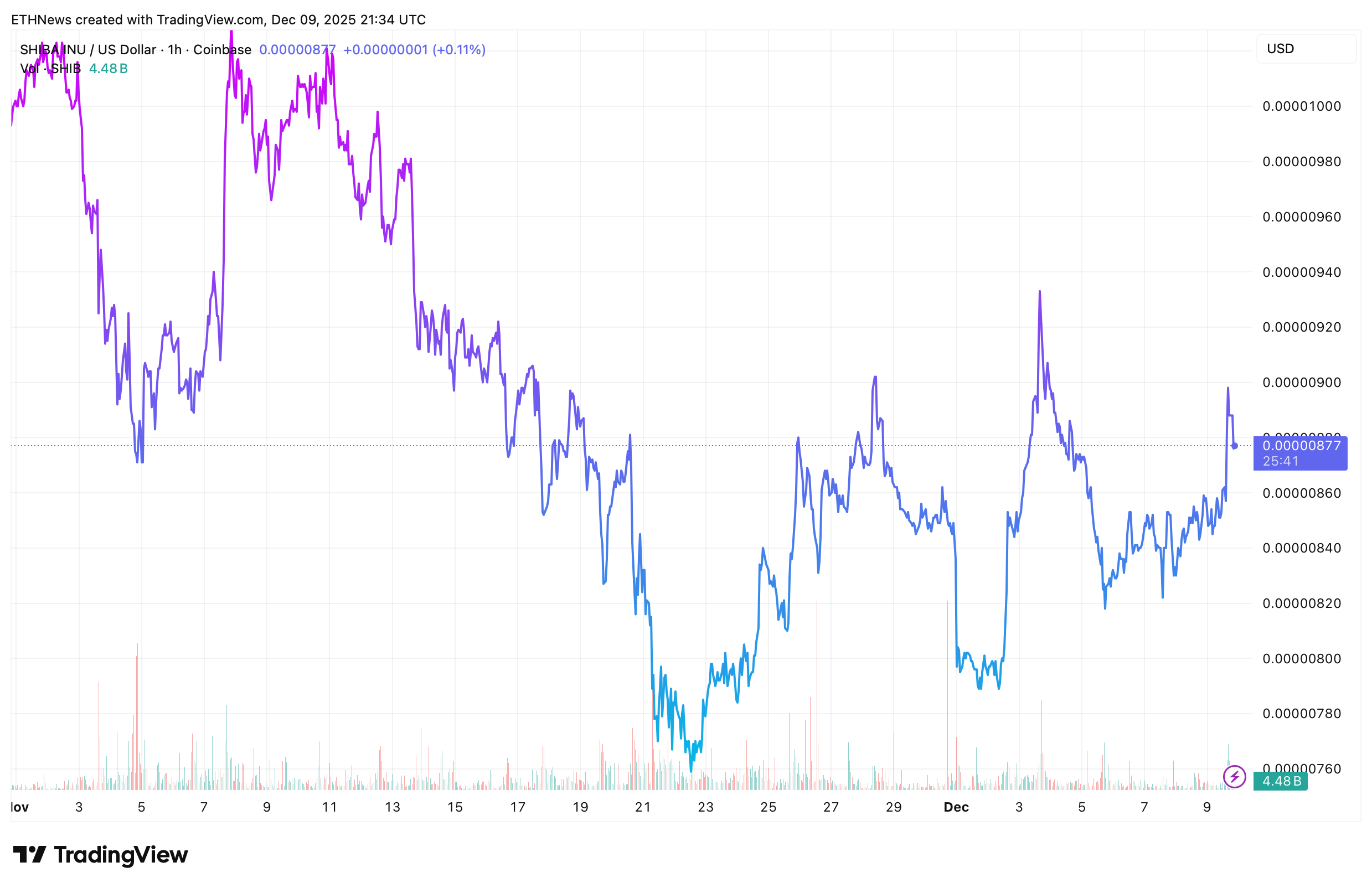 The accompanying price chart from TradingView paints a clear picture of the recent consolidation phase. SHIB has been trading within a wide range throughout November and early December, slipping to a monthly low before rebounding into the mid-range.