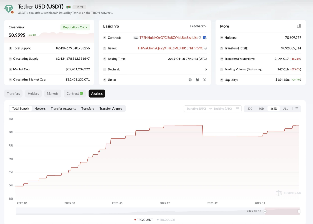 Looking at Tether’s market trends, recent data reveals a steady increase in the circulating supply of USD₮, currently surpassing 82 billion USDT. Additionally, the number of Tether holders has consistently grown, reaching over 70 million, indicating growing trust in stablecoins.