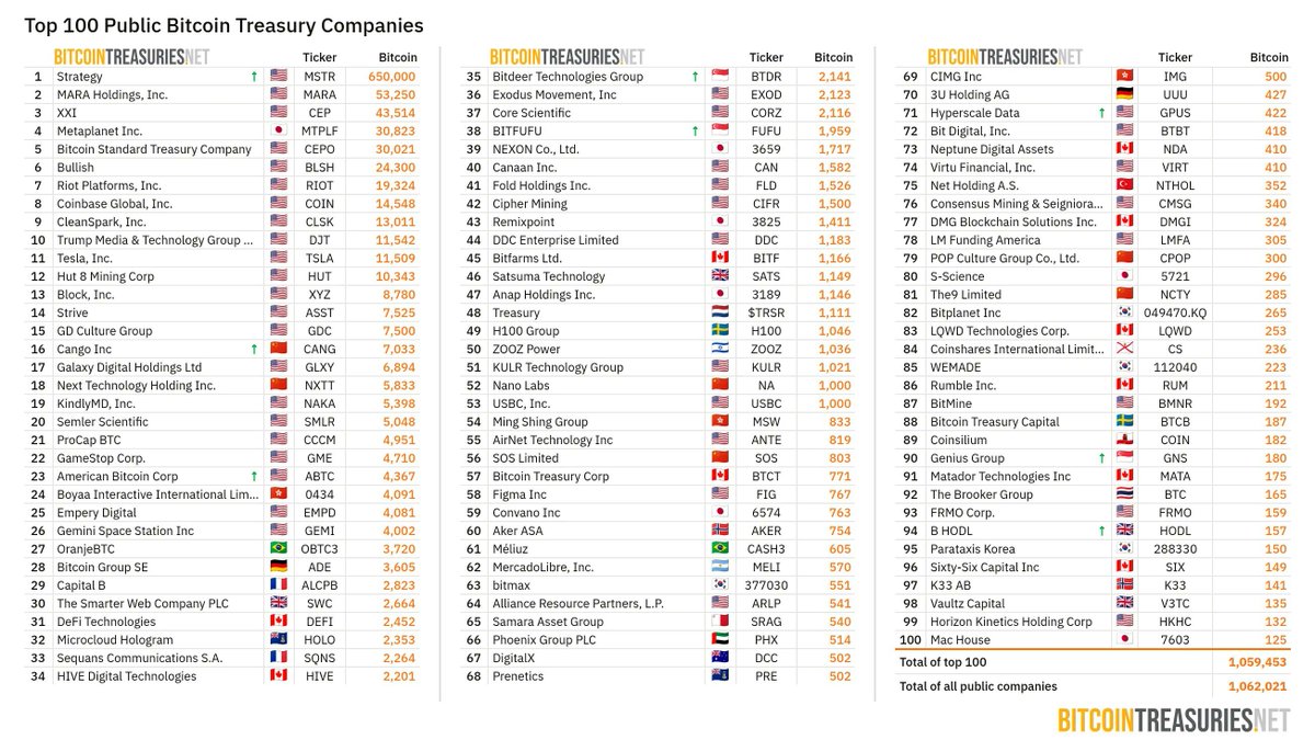 A new dataset from BitcoinTreasuries.net reveals that the world’s top 100 publicly traded companies collectively hold 1,059,453 BTC, marking one of the largest concentrations of corporate Bitcoin ownership ever recorded.