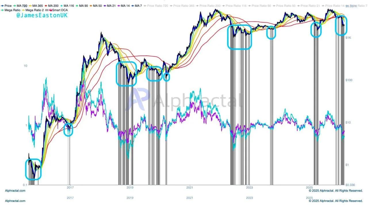 An analysis of Ethereum's long-term chart by James Easton on X reveals a significant increase in the "Smart DCA" indicator. This indicator has historically coincided with market accumulation phases. The chart, which includes multiple moving averages (MA7, MA14, MA21, MA50, MA90, MA116, MA200, MA365, and MA720), highlights past instances where the signal appeared during consolidation periods before substantial price increases. Annotations on the chart, including the Mega Ratio indicators, suggest that the recent acceleration of the Smart DCA signal points to renewed accumulation in Ethereum's market structure. Vertical gray bands on the chart mark previous signal zones that historically represented transitions from corrections to recovery periods, with the latest signal appearing as the indicator rises again after a recent dip.