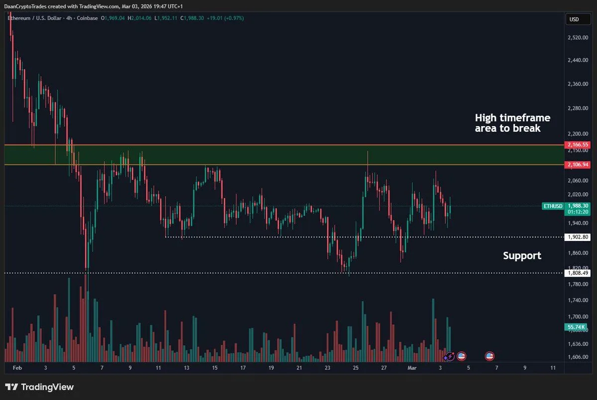 In parallel, a four-hour chart analysis by Daan Crypto Trades on X indicates that Ethereum's price is gradually increasing, marked by a series of higher lows. The price action is confined within a consolidation structure, fluctuating between a support area and a resistance zone. The primary resistance is observed around the $2,100 mark, a level that ETH has approached multiple times recently without achieving a sustained close above it. This $2,100 zone is identified as a critical higher time frame level that needs to be breached for a shift in short-term momentum. Support is noted near the $1,800 level, from which the price previously rebounded after a significant drop, establishing the lower boundary of the current trading range. The consistent formation of higher lows while repeatedly testing the upper range suggests underlying upward pressure, though the resistance at $2,100 continues to limit advances pending a confirmed breakout.